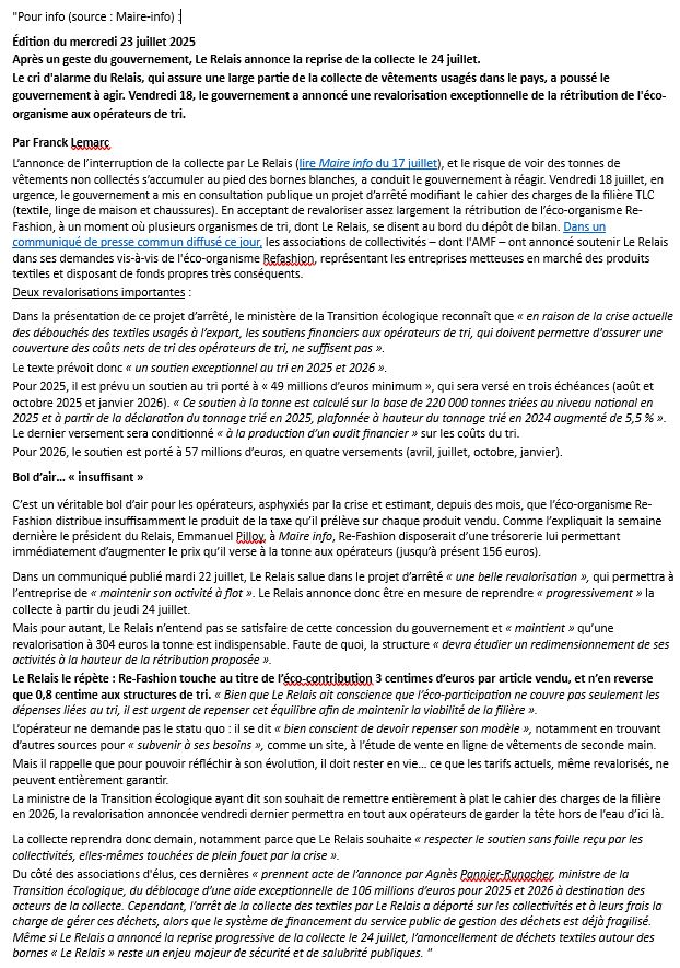 Reprise de la collecte des textiles