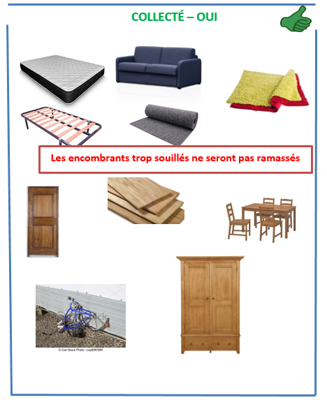 Suite à l’augmentation régulière du volume d’encombrants, le prestataire de collecte fait savoir qu’il respectera dorénavant strictement les termes du contrat à savoir, par adresse: 1.5 m³, une longueur de 2 m pour les objets rigides, 2 m pour les objets souples et un poids de 70 kg maximum.